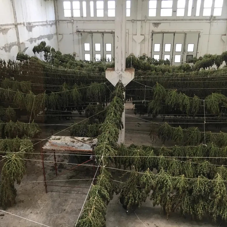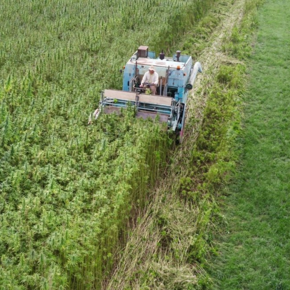 De toppen van de hennepplanten worden geoogst en deze biomassa wordt overgebracht naar GGE faciliteiten om daar te drogen.